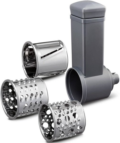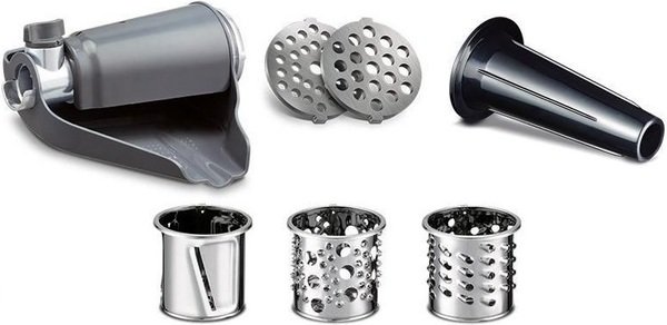 3 барабана для грубой и мелкой нарезки и шинковки входят в комплект: готовьте свежие овощные салаты и гарниры каждый день без труда; 2 решетки из нержавеющей стали для разных типов перемола в зависимости от блюда – среднее или грубое. Насадка для колбас поможет приготовить домашние сосиски и сэкономит время.