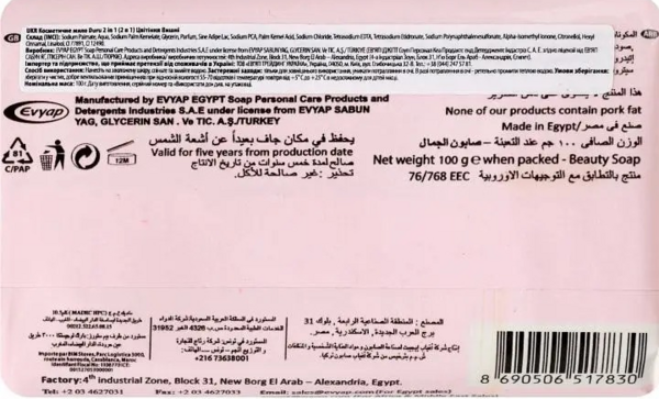 | Состав | Sodium palmate, aqua, sodium palm kernelate, glycerin, parfum, sine adipe lac, sodium PCA, palm kernel acid, sodium chloride, tetrasodium EDTA, tetrasodium etidronate, sodium polynaphthalenesulfonate, alpha-isomethyl ionone, citronellol, hexyl cinnamal, linalool, CI 77891, CI 12490 |