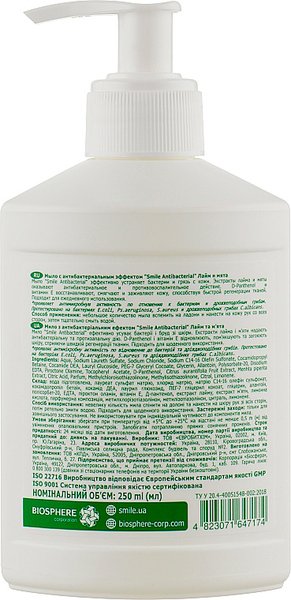 Smile antibacterial мыло с лаймом и мятой имеет антибактериальный эффект, который позволяет уничтожать до 99% бактерий на коже рук и тела. В составе витамин Е, который обладает способностью подавлять воспаление, ускоряет заживление ран, благодаря антиоксидантному эффекту способен омолаживать кожу. Экстракты лайма и мяты имеют антисептическое и бактерицидное свойства.