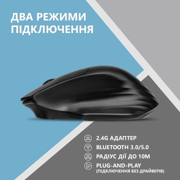 Полноразмерная большая мышь анатомической формы выполнена в сдержанном дизайне. Дополнительная подставка под большой палец делает мышку максимально удобной для длительного использования. Выполнена из качественного и приятного на ощупь ABS пластика. 3D-колесо прокрутки ритмичное и позволяет точно перемещаться между абзацами. Имеет два режима подключения через 2.4G адаптер и Bluetooth 3.0/5.0. Совместима с устройствами на Windows, Android, Mac OS.