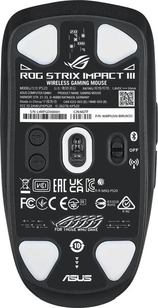 Переключатели, используемые в ROG Strix Impact III Wireless, имеют ресурс в 70 миллионов нажатий. Чтобы минимизировать отклонение силы срабатывания левой и правой кнопок мыши, подбираются пары переключателей с отклонением силы в диапазоне +/-5 г, что обеспечивает стабильное ощущение нажатия.