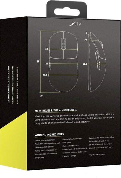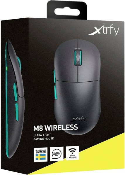 Несмотря на то, что мышь M8 беспроводная, с батареей 300 мА и корпусом без отверстий, это самая легкая мышь Xtrfy. Тщательно продуманная конструкция обеспечивает минимальный вес без ущерба для прочности.