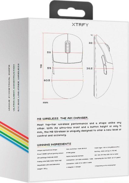 Несмотря на то, что мышь M8 беспроводная, с батареей 300 мА и корпусом без отверстий, это самая легкая мышь Xtrfy. Тщательно продуманная конструкция обеспечивает минимальный вес без ущерба для прочности.