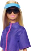 Barbie выбрала удобный образ для активного дня - фиолетовую футболку, шорты в тон и прочные туристические ботинки. Солнцезащитные очки и козырек, завершают ее образ путешественницы.