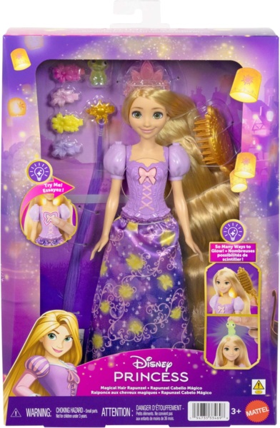 Благодаря пяти способам активации подсветки кукла "Волшебные волосы Рапунцель" из серии "Принцессы Диснея" сделает игры яркими и незабываемыми. Вдохновленная героиней мультфильма "Рапунцель: Запутанная история", кукла имеет волосы, которые светятся, когда дети расчесывают их, как в фильме. Дети могут нажать на кнопку на ободке или бантике куклы, чтобы включить огоньки, или прикрепить к ободку друга Рапунцель — хамелеона Паскаля и ее тиару, чтобы игра стала еще ярче. Кукла не может стоять самостоятельно.