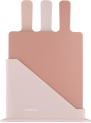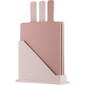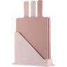 Набор содержит три пластиковые доски коричневого и бежевого цветов и подставку для удобного хранения.