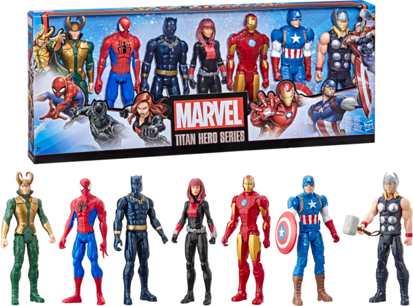 Встречайте самых любимых персонажей Marvel в большом наборе Titan Hero Series. Этот набор включает 7 фигурок супергероев размером 30 см: Капитан Америка, Черная Пантера, Локи, Тор, Железный Человек, Человек-Паук и Черная Вдова.