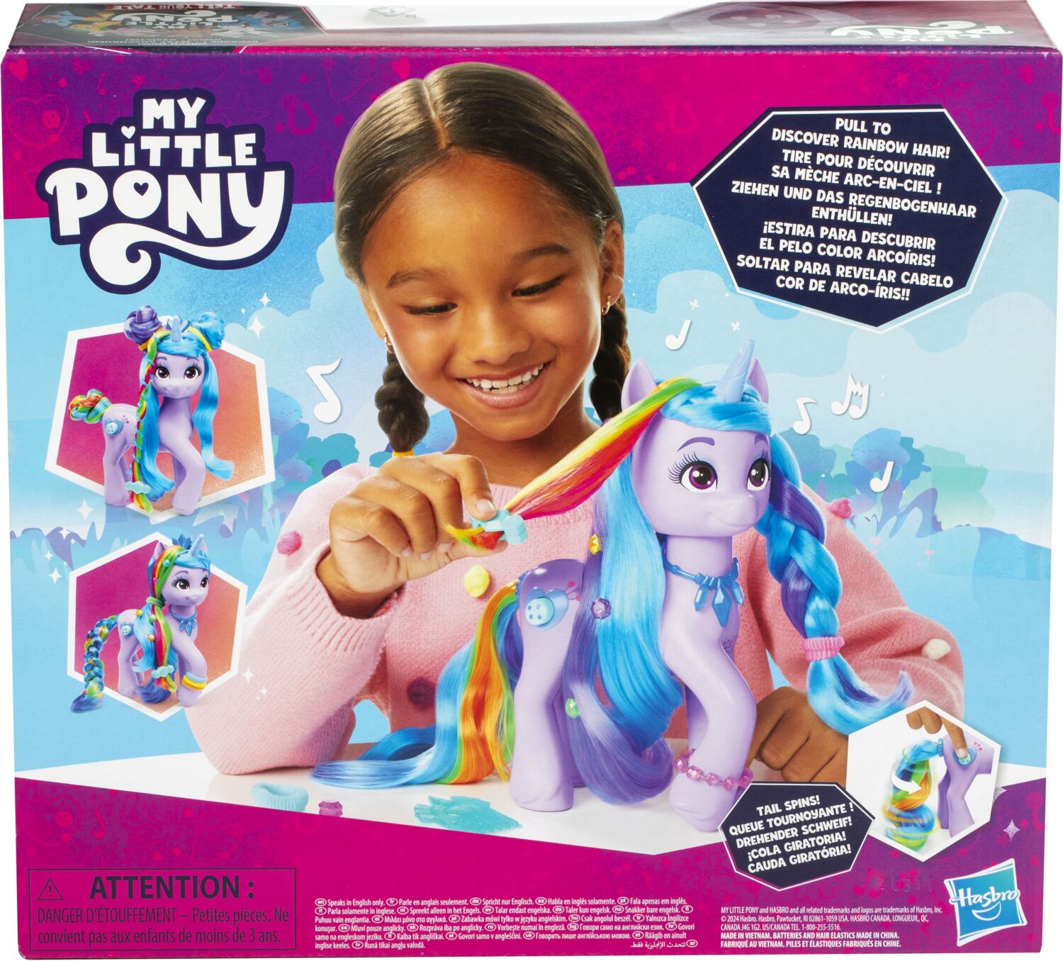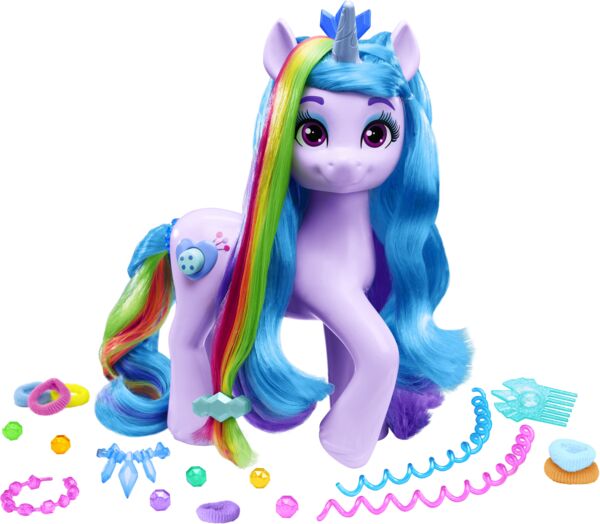 Потяните за зажим на конце радужных волос Иззи, чтобы раскрыть длинную, красочную гриву. Этот пони обеспечивает вдвое больше удовольствия от укладки благодаря длинной, мягкой гриве и хвосту.