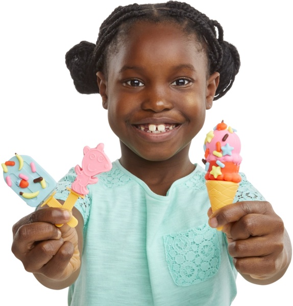 Набор позволяет детям создавать и украшать воображаемое мороженое, рассказывая красочные истории с Пеппой и Джорджем в главных ролях.