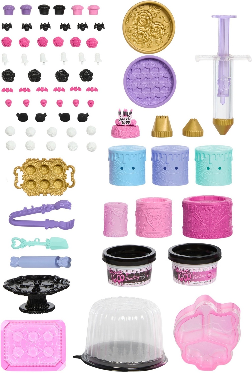 Время окунуться в монструозное кулинарное безумие вместе с игровым набором Monster High серии "Страх какой сладкий день рождения" Торт по рецепту Клодин. Помогите Клодин создать ужасно милые торты для страшной сладкой вечеринки Дракулоры, празднующей свои 1600 лет.