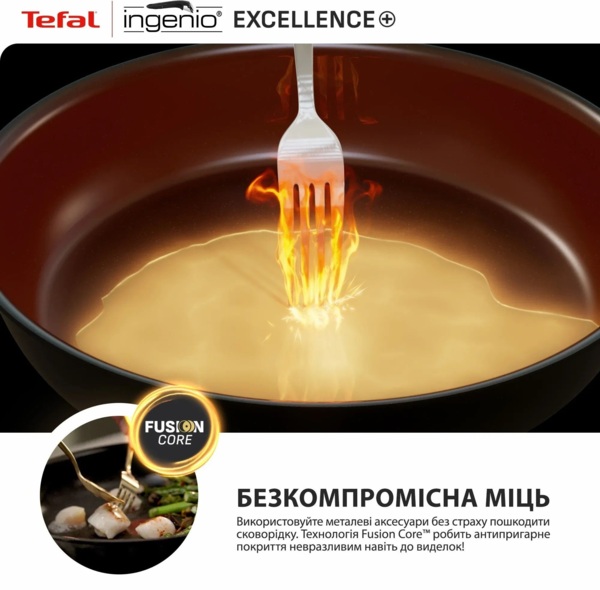 Дополнительный слой микропористого алюминия позволяет сделать антипригарное покрытие частью самой сковороды, а не просто слоем сверху. Используйте металлические приборы, не опасаясь повредить посуду. Технология Fusion Core делает антипригарное покрытие устойчивым даже к вилкам.