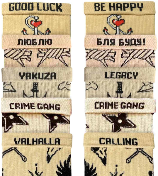 - Для каждой пары Носкар придумывает забавную фразу, которую можно найти, отвернув край носка;