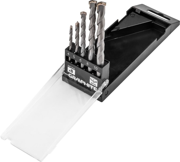 Набор сверл по бетону Graphite создан для выполнения точных и надежных отверстий в твердых минеральных материалах во время бытовых и монтажных работ. Продуманная конструкция сверл обеспечивает стабильное вхождение в материал и контролируемый процесс сверления, что особенно важно при установке дюбелей, крепежей и монтажных элементов. Сверла демонстрируют уверенную работу в бетоне, кирпиче и камне, позволяя получать аккуратные отверстия без лишних вибраций. Диапазон диаметров охватывает самые популярные размеры, которые используются при монтаже полок, карнизов, кронштейнов, кабель-каналов и бытовой оснастки.
