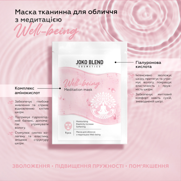 - Маска тканевая для лица с медитацией Well-being :помогает поддерживать водный баланс кожи, улучшая ее эластичность и придавая природное сияние. Гиалуроновая кислота в составе дарит коже мягкость и упругость, а комплекс аминокислот способствует обновлению и укреплению эпидермиса. Медитация настраивает на принятие себя, положительные мысли и раскрытие любви к своему внутреннему миру, сочетая уход за внешностью с заботой об эмоциональном состоянии;