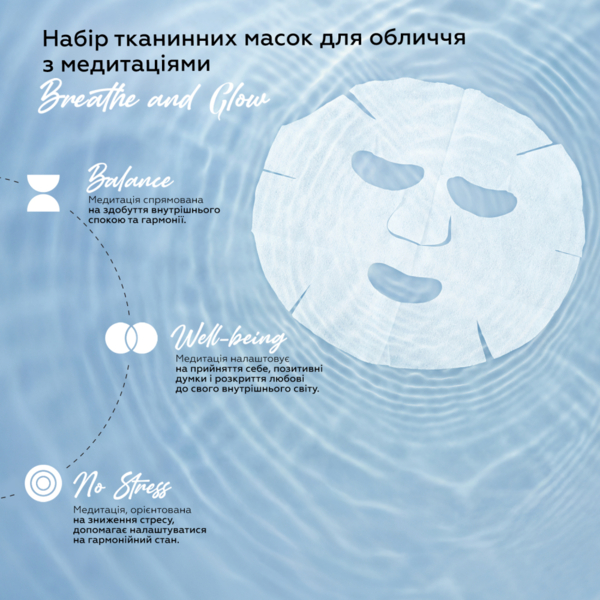 - Каждая маска сопровождается аудиомедитацией, созданной специально для усиления расслабления и внутренней гармонии;