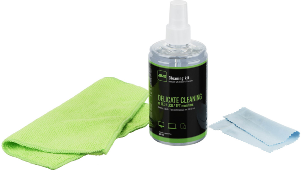 Чистящий набор, состоящий из чистящей жидкости + 2 салфетки 20х20 и 10х10 см. Для мягкого и безопасного удаления грязи, пыли и жирных пятен с экранов электронной техники. Применим для чистки LED/LCD/TFT мониторов, ноутбуков, ТВ техники и портативной электронной техники.