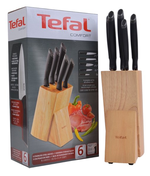 - Набор ножей Tefal Comfort 6 предметов, пластик, нержавеющая сталь, деревянная подставка (K221SA14)