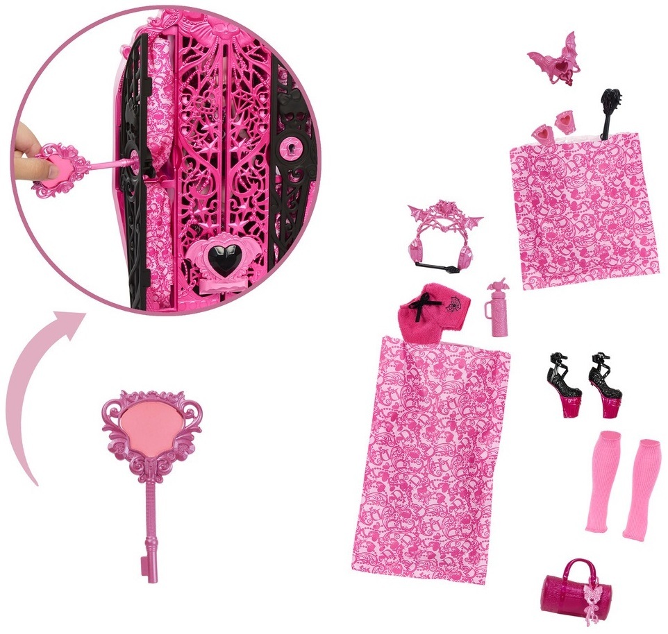 Целое приключение, полное загадок и сюрпризов, ждет девочку с этим набором "Ужас-секреты" и куклой Дракулауры из Monster High! Дракулаура прячется где-то в шкафу, который формой напоминает ворота школы Monster High. Но где же сама кукла? Ищите подсказки в инструкции, чтобы узнать, где она находится, и в процессе найдите более 19 других фантастических сюрпризов. Действуйте в три этапа: разгадывайте, разблокируйте, открывайте. Это будет настоящий крутой квест с немалым количеством подарков в конце! Сначала с помощью ключа-лупы разгадайте, что за символы изображены в инструкции на карте сокровищ. Далее откройте дверцу шкафа, используя тот же ключ, чтобы найти жетоны, которые соответствуют символам на карте. Они скрыты где-то среди одежды и тематических аксессуаров в загадочных пакетиках. Следуя инструкции, сложите три жетона вместе - и вы получите единый талисман. Вставьте его в отверстие шкафа, в той части, где нет дверцы, с самого низа, а затем тяните талисман вверх вдоль отверстия, как молнию. А вот и она - ужас какая крутая Дракулаура, во всей своей монструозной красе, поднимается, будто лифтом, вверх! Поднимайте и опускайте ее снова и снова для непрерывной забавы. Теперь, когда Дракулауру, ее наряды и аксессуары в стиле поп-звезды, найдено, время устроить развлечения с переодеванием. Более 125 комбинаций одежды и аксессуаров позволят создавать множество различных образов. После завершения игры дети от 4 лет могут сложить куклу, одежду и аксессуары, входящие в комплект, в таинственный шкаф, который идеально подходит как для игры, так и для хранения мелочей! Кукла не может стоять самостоятельно. Цвета, аксессуары и внешний вид, могут отличаться от изображенных.