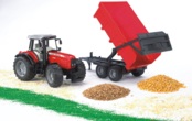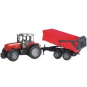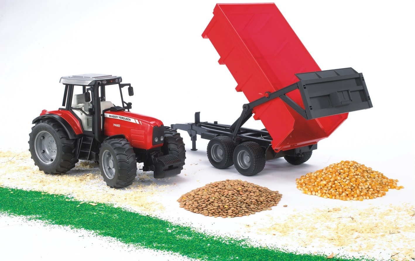 Масштабированная копия трактора Massey Ferguson 7480. Кузов прицепа поднимается для выгрузки груза, при этом задний борт автоматически открывается.