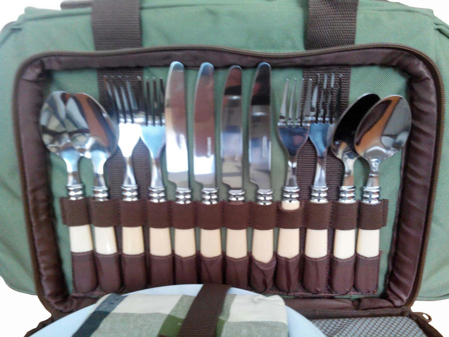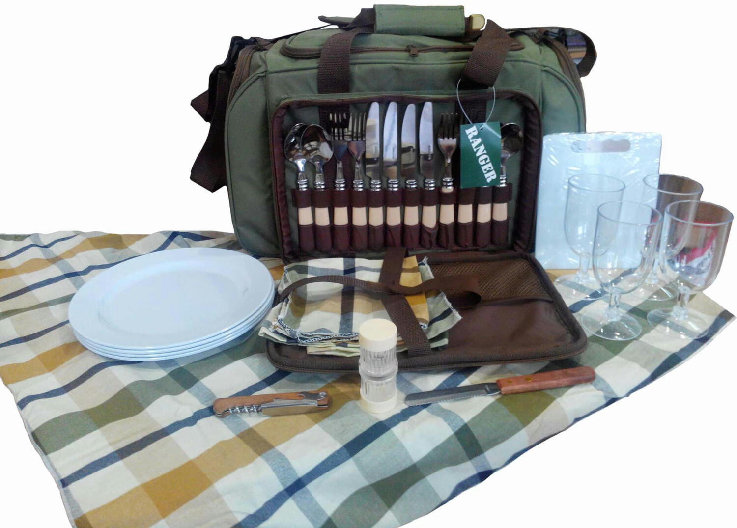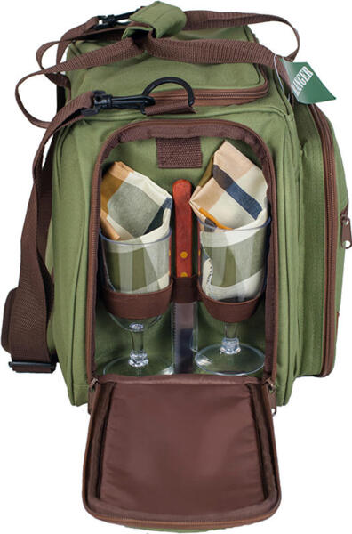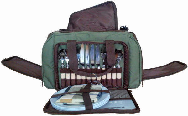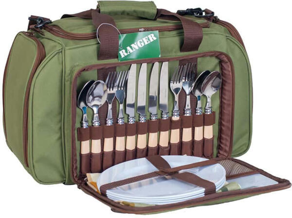 Возьмите с собой набор для пикника Ranger Pic Rest НВ 4-605 - здесь уже собрано все, что вам понадобится. Эта модель рассчитана на компанию из четырех человек. В сумке большой изотермический отдел, в котором продукты сохранятся свежими, напитки прохладными, и все доедет до места в целости и сохранности. Термоотделение оснащено съемным полиэтиленовым чехлом, который в случае необходимости можно помыть. Накройте стол скатертью и салфетками из хлопчатобумажной ткани, сервируйте столовыми приборами - вилками, ложками и ножами, поставьте на стол тарелки, бокалы, перечницу и солонку - все готово! Дощечка для нарезки тоже под рукой, да и хлебный нож не забыт, открывалка для бутылок и банок. Вся посуда изготовлена из высококачественного пластика и пищевой стали. Сумка к набору для пикника - очень вместительная и компактная. Вы обязательно оцените удобный и практичный набор для пикника на 4 персоны.