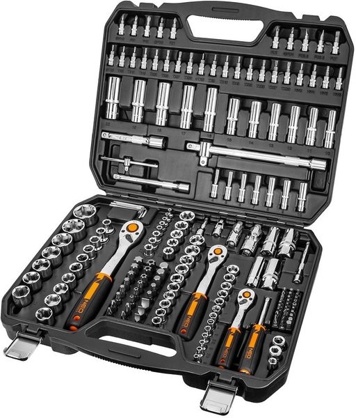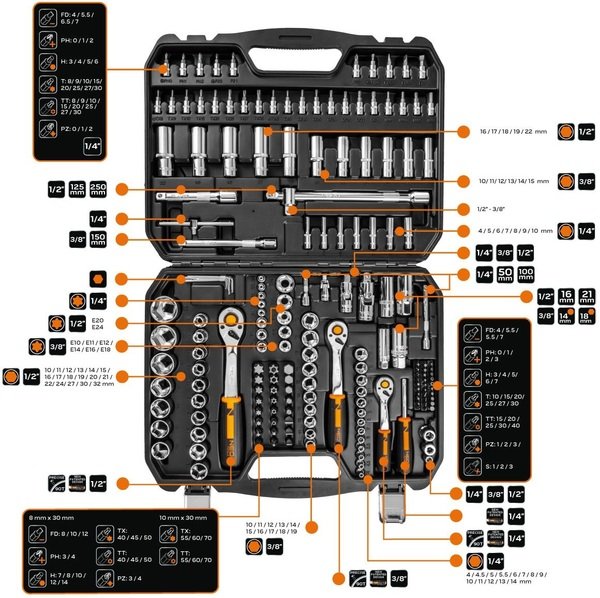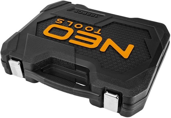 Набор торцевых ключей NEO (арт. 10-074) представляет собой полный комплект торцевых головок 1/2", 3/8" и 1/4" и принадлежностей. Он включает 182 шт., изготовленных из высококачественной хромованадиевой стали. В практичном и прочном пластиковом футляре с металлическими защелками и удобной ручкой. Внутри футляра вы найдете полный комплект шестигранных головок и головок Е-типа (для винтов TORX)., благодаря возможности быстрой смены наконечника. В комплект входит богатый пакет принадлежностей, а возможности подгонки инструмента под нужды практически безграничны. В набор входит целых 3 головки для свечей: 16 мм (шестигранник), 18 мм (шестигранник) и 21 мм (шестигранник) Состав набора позволяет быстро собрать из имеющихся элементов штифтовой ключ, идеально подходящий для конкретного типа двигателя. Чтобы можно было работать в местах с ограниченным пространством (перескок защелки происходит уже при повороте на 5 градусов). Набор для всех пользователей, желающих иметь максимально широкий пакет розеток. Качество и надежность инструмента подтверждены 25-летней гарантией и международным сертификатом TÜV. Бренд NEO оправдывает ожидания профессионалов.