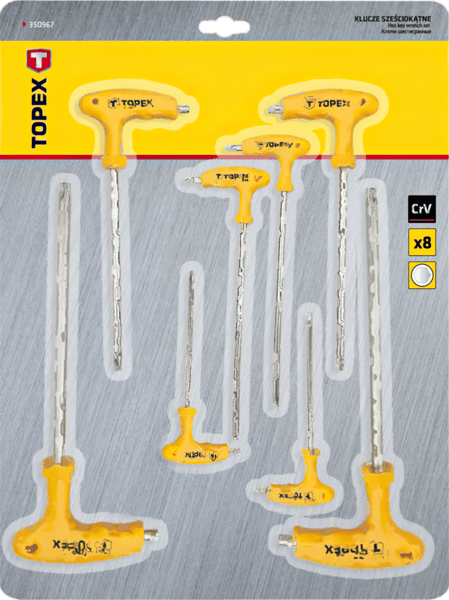 Ключи шестигранные Т-образные TOPEX изготовлены из прочной хромомолибденовой стали, обеспечивающей долгий срок службы инструмента. Каждый из восьми ключей, входящих в набор, имеет пластмассовую рукоятку эргономичной формы. Бренд TOPEX предназначен для домашних мастеров.