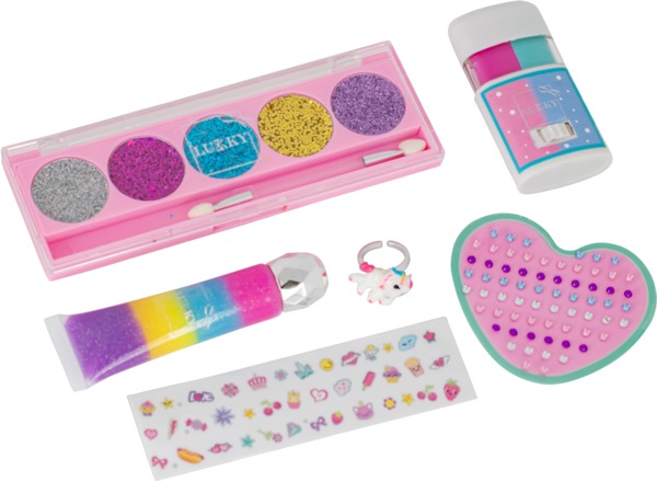 | Комплектация (возможны изменения в разных поставках) | Блеск, Блестки для ногтей, Мел для волос - 2 шт., Наклейки для ногтей, Палетка теней, Пластиковое кольцо «Единорог» |