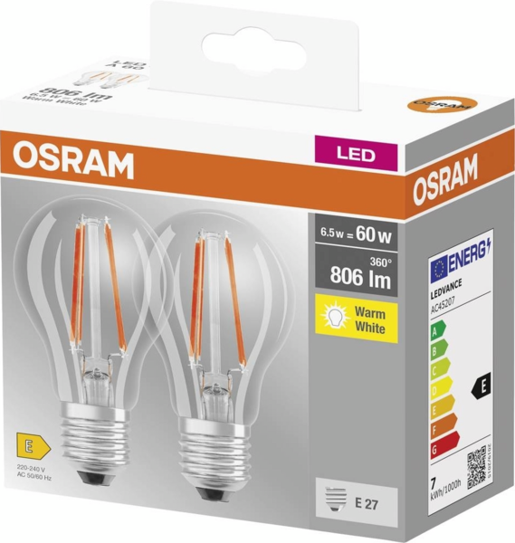 - Набор ламп 2шт Osram Led E27 6.5Вт 2700К 806Лм A60 (4099854064098)
