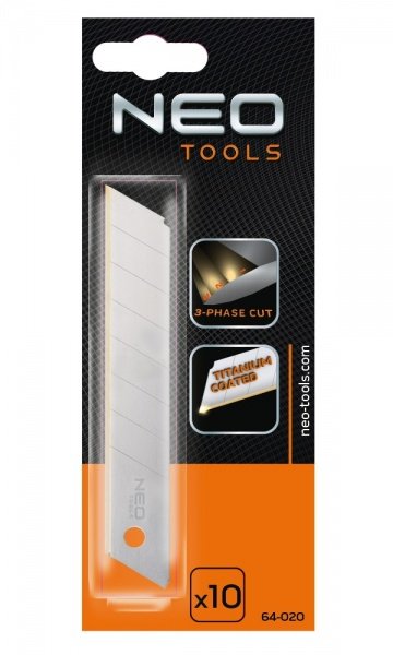 Лезвия отламывающиеся сменные NEO шириной 18 мм и толщиной 0.5 мм. Это запасные лезвия для ножей. Режущие кромки с титановым покрытием, увеличивающим срок службы инструмента. В комплекте 10 штук. Бренд NEO оправдывает ожидания профессионалов.