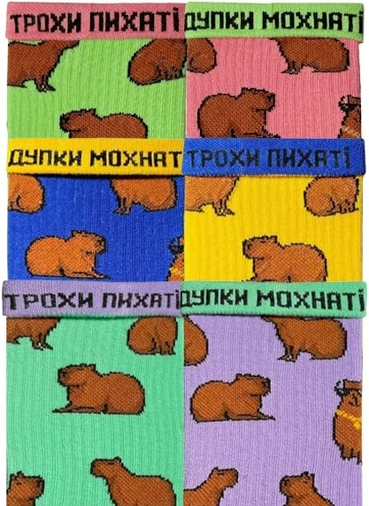 Яркий дизайн с капибарами делает эти носки уникальными и запоминающимися. Дизайны отличаются не только цветами, но и деталями рисунков. Для каждой пары Noskar придумывает забавную фразу, которую можно найти, отвернув край носка.