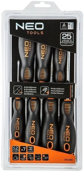 Набор отверток NEO содержит 7 отверток: шлицевые и крестовые. Стержень отвертки изготовлен из чрезвычайно прочной стали S2. Рабочая часть подвергнута термообработке, благодаря чему получена требуемая твердость и стойкость к изгибу. Отвертка с намагниченным жалом. Трехгранная форма рукоятки с профилированной опорой для большого пальца уменьшает нагрузку на ладонь во время работы и облегчает быстрое вращение отвертки. Двухкомпонентная рукоятка предотвращает скольжение в ладони, устойчива к воздействию химических веществ, масел и смазок. Качество инструмента подтверждено 25-летней гарантией производителя. Бренд NEO оправдывает ожидания профессионалов.