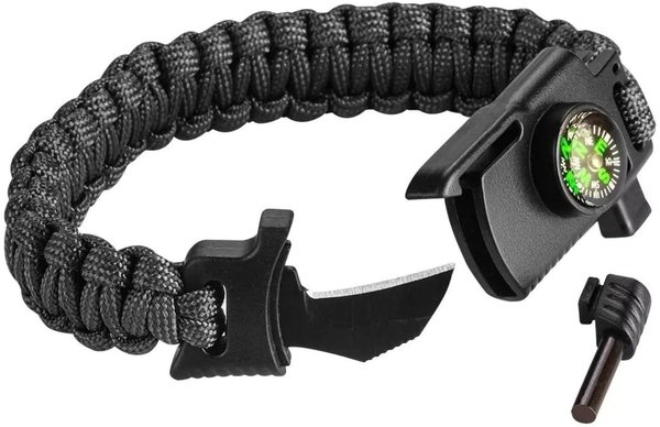 Это многофункциональное изделие, состоящее из чрезвычайно прочного паракордового шнура длиной 3.5 м и максимальной его прочностью до 250 кг. Браслет также имеет кремень 5x20 мм, компас, нож и свисток. Ширина браслета 26 мм, окружность 240 мм.