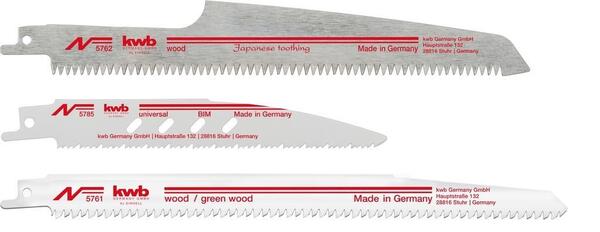 Набор пильных полотен KWB к сабельной пиле из 3 штук: Полотно для дерева и чистовой резки HCS 240/220 мм. Полотно для дерева и быстрой (грубой) резки HCS 230/195 мм. Полотно для резки металла, алюминия, пластика, дерева с остатками металла, биметалл 150/130 мм.