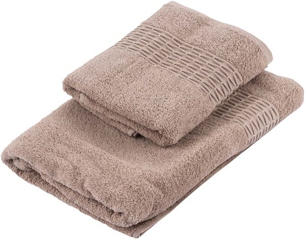 Плотность – 420 г/м2, благодаря чему изделия мягкие и износятся нескоро. В наборе полотенце для лица и банное.