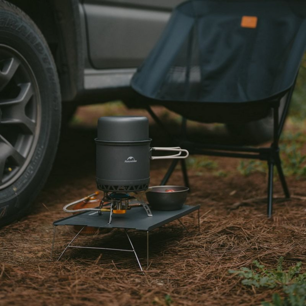 В наборе есть два предмета: котелок и сковорода (45х165 мм), что позволяет одновременно готовить первые и вторые блюда, экономя время и топливо для газовой горелки (горелка и баллон не входят в комплект). Сковороду можно использовать как крышку во время приготовления пищи в основной емкости. В производстве посуды использован сверхлегкий алюминиевый сплав и пищевая сталь 304, принадлежащая к типу нержавеющих металлов. Материалы отличаются устойчивостью к механическим повреждениям и невосприимчивостью к воздействию экстремальных температур. Чтобы пища не прилипала ко дну посуды во время жарки, в емкостях предусмотрено антипригарное покрытие. Обе емкости укомплектованы складными ручками со вставками, которые не нагреваются во время длительного воздействия жара. В нижней части котелка предусмотрена ветрозащита с концентрирующими кольцами, повышающими эффективность нагрева емкости, минимизирующими потерю тепла, а также ускоряющими закипание воды и приготовление пищи на 20-30% по сравнению с обычной походной посудой. Емкости легко очищаются после использования. Пользователь может поместить внутрь котелка туристическую горелку и газовый баллон на 230 г для минимизации размеров снаряжения и его удобной транспортировки. Для хранения предназначен сетчатый мешочек, который закрывается с помощью шнура с фиксатором.