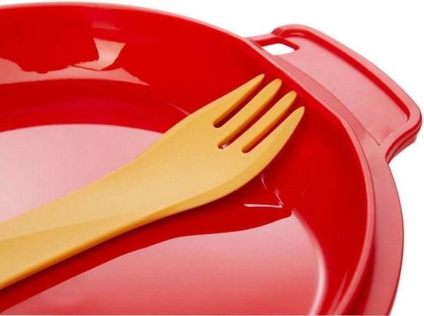 - Отверстия в ручках тарелки и миски для карабина/шнура.