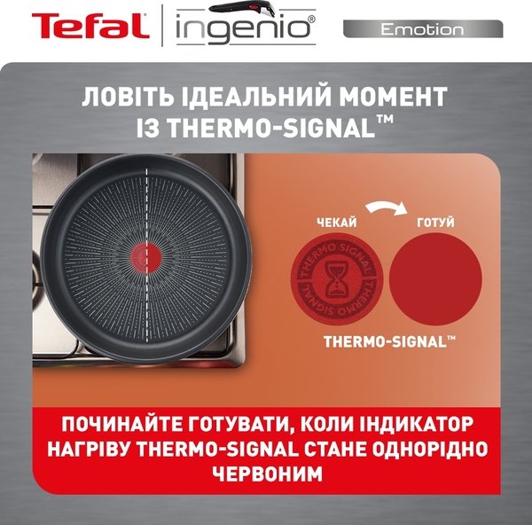 Секрет идеального приготовления в правильной температуре в начале приготовления. Посуда Ingenio оснащена Thermo-Signal - индикатором, который становится равномерно красным, когда сковорода достигла идеальной температуры для начала приготовления.