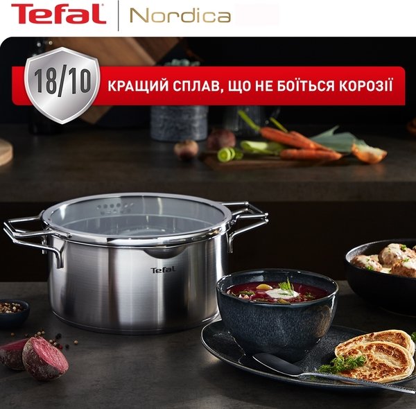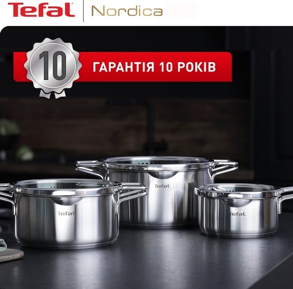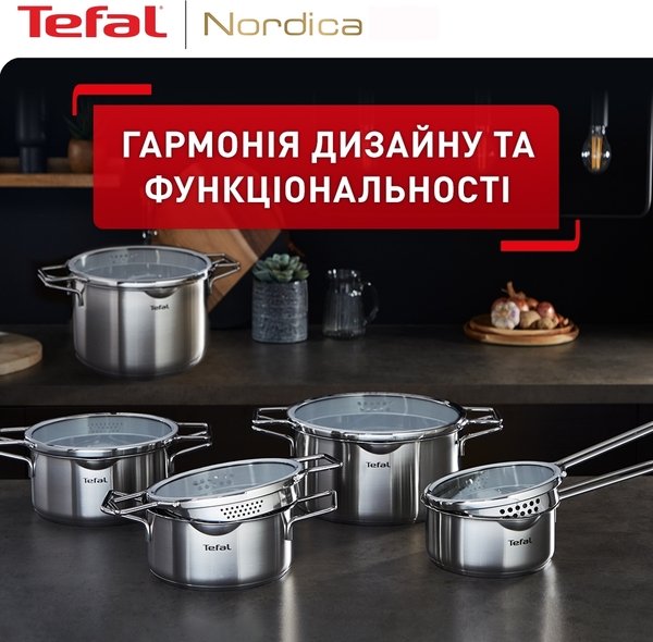 Минималистичный и продуманный дизайн набора посуды Tefal Nordica дополнит любой интерьер. Продуманный до мелочей набор кастрюль станет незаменимым помощником для приготовления вкусных и полезных блюд.