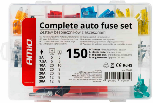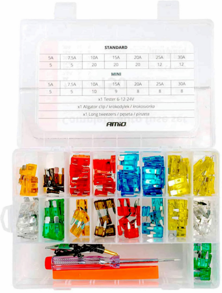 Набор предохранителей Amio с тестером зажимом и пинцетом 03037 (5903293030370)