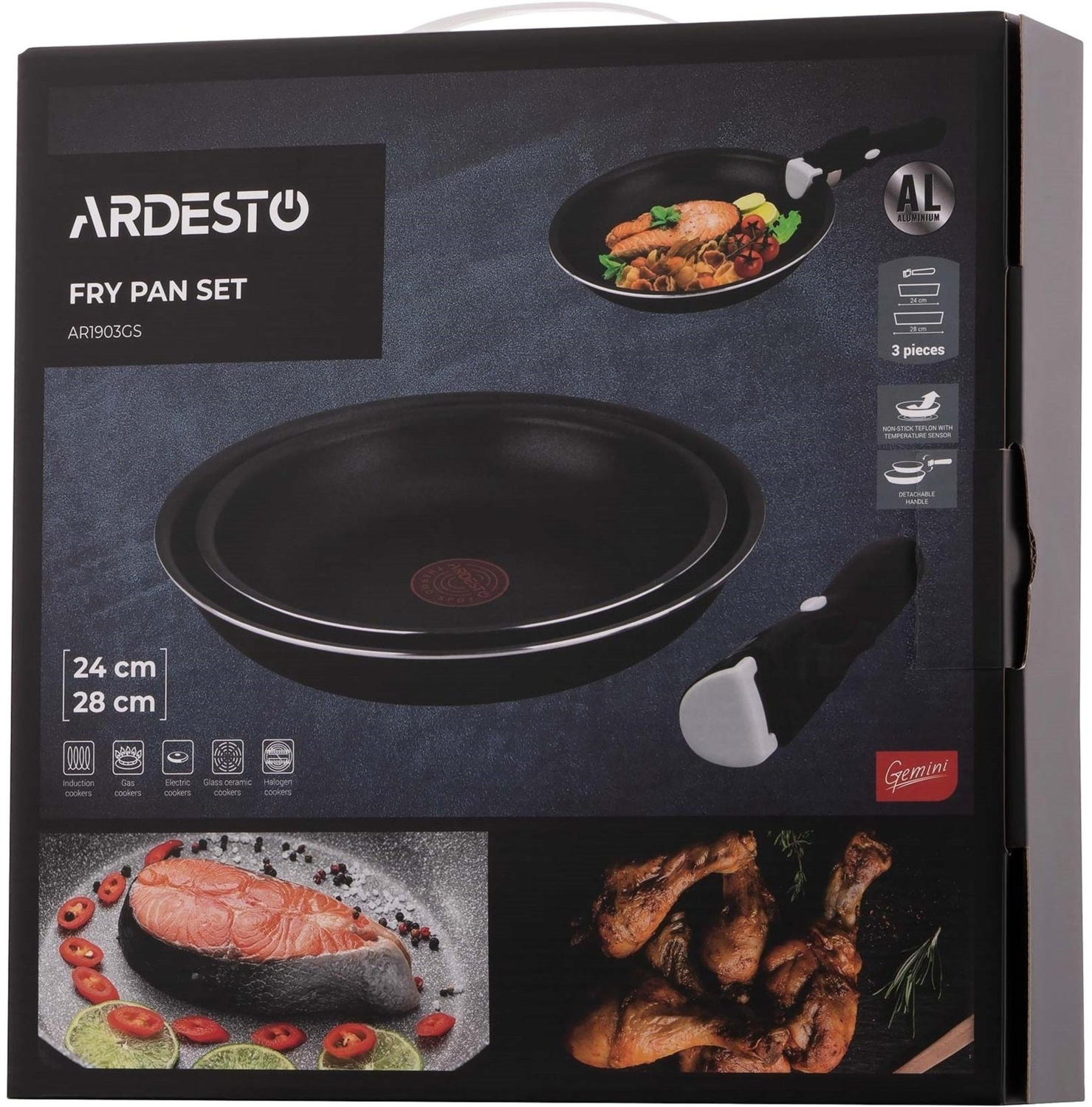 - Набор сковород ARDESTO Gemini, 3 пр.:24,28 см, сьемн. руч, алюминий (AR1903GS)