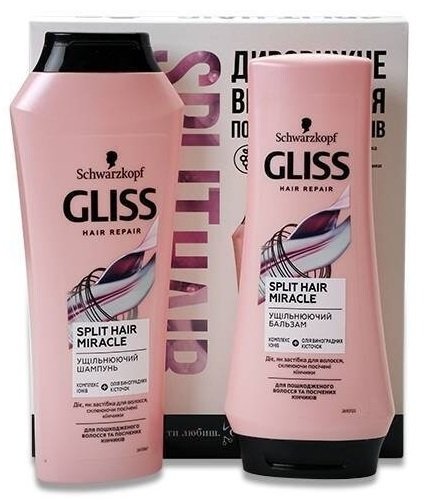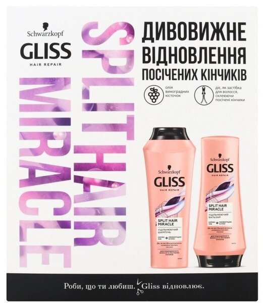 В подарочный набор входят шампунь и бальзам. Линейка по уходу за волосами GLISS Split Hair Miracle с КОМПЛЕКСОМ ИОНОВ и МАСЛОМ ВИНОГРАДНЫХ КОСТОЧЕК выравнивает структурные различия волос от корней до кончиков, склеивая секущиеся кончики для ощущения сильных и здоровых волос.
