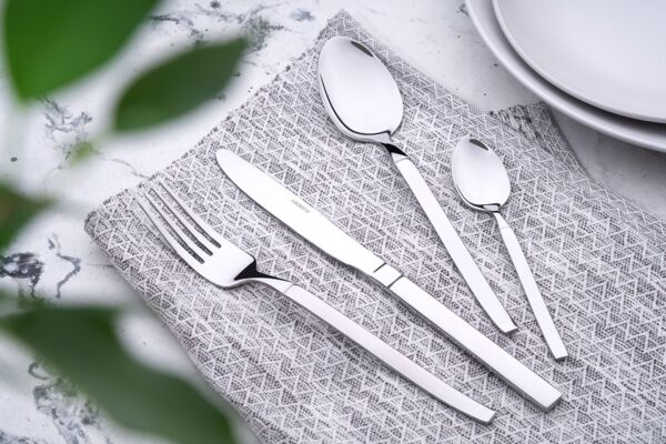 Якісний столовий набір. Все предмети якісно вилиті, немає дефектів, все блищить. В руці всі предмети зручно тримати. Комплектні ножі нормально ріжуть, немає такого що просто для галочки. Миються легко що руками що в посудомийній машині. Такий набір коли купуєш то мінімум років на 10. Думаю він і доше прослужить.