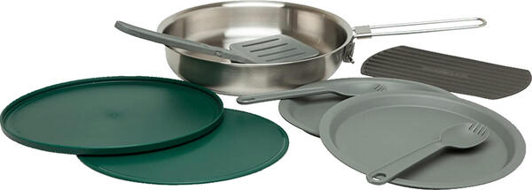 Отправляясь в путешествие, стоит задуматься о том, чтобы взять с собой надежную и удобную посуду. Обычные тарелки и кастрюли с кухни точно не подойдут, потому что они вряд ли поместятся в ваш рюкзак. Соответственно, стоит подойти к подбору варианта серьезно. Набор Stanley Adventure Fry Pan идеальное решение в подобной ситуации. Производитель Stanley добавил в него прочную сковороду с крышкой, которая обладает объемом 0,95 к. Также здесь есть 2 туристические тарелки и 2 ложки-вилки. Привести в действие такой комплект для готовки под открытым небом максимально легко и в нем есть все, чтобы сразу начать трапезу. Многие рассматривают более крупные наборы, потому что хотят получить все и сразу. На самом деле здесь нет ничего лишнего и если вас привлекает обед на костре, то просто идеальный вариант. Приготовить порцию еды для целой группы туристов получится без особых проблем. Если с первого раза не получится, то можно попробовать несколько раз и тогда накормить всех точно удастся. Стоит отметить еще и отличные показатели прочности данного набора. Прежде всего за счет использования нержавеющей стали в процессе изготовления сковороды. Остальные элементы комплекта сделаны из качественного пластика.