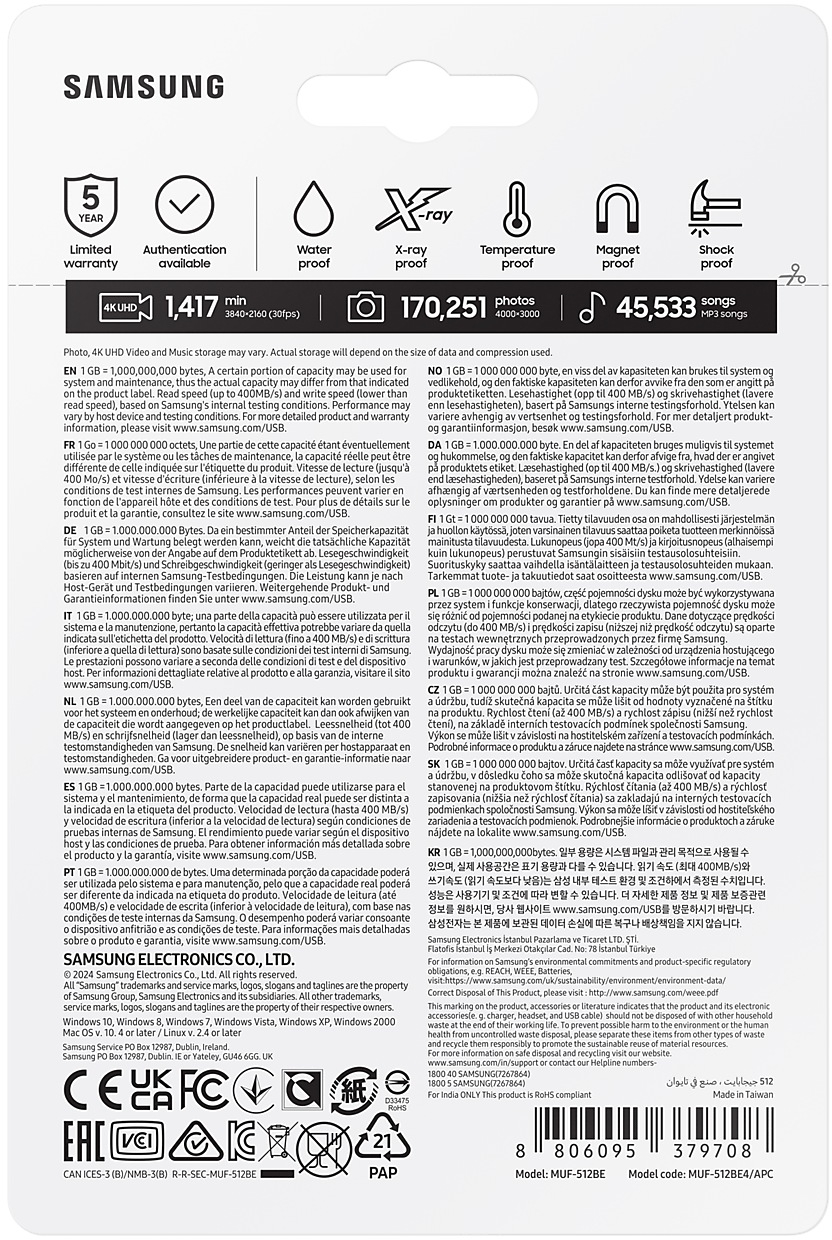 Файлы остаются в безопасности, где бы вы ни были. Технология флэш-памяти Samsung делает BAR Plus надежным накопителем для хранения ваших ценных данных. Он обеспечивает защиту от воды, ударов, магнитов, перепадов температуры и рентгеновских лучей.