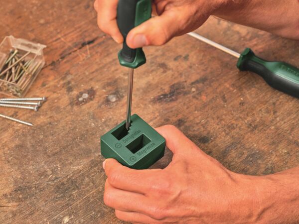 Устройство для намагничивания и размагничивания отвёрток и бит. Оно предназначено для того, чтобы облегчить работу с крепежом. Намагниченные отвёртки и биты помогают удерживать мелкий крепёж (винты, шурупы) на инструменте, что особенно удобно при работе в труднодоступных местах. Размагничивание может быть полезно, если нужно предотвратить прилипание металлической стружки к инструменту.