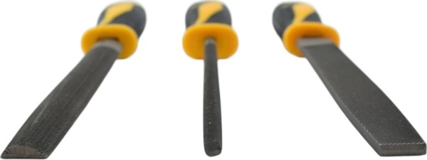 Ручной абразивный инструмент подходит для твердых или мягких материалов. Можно использовать для обработки металла, дерева или пластмассы. В комплект входят 3 напильника: с плоским, круглым, полукруглым профилем.