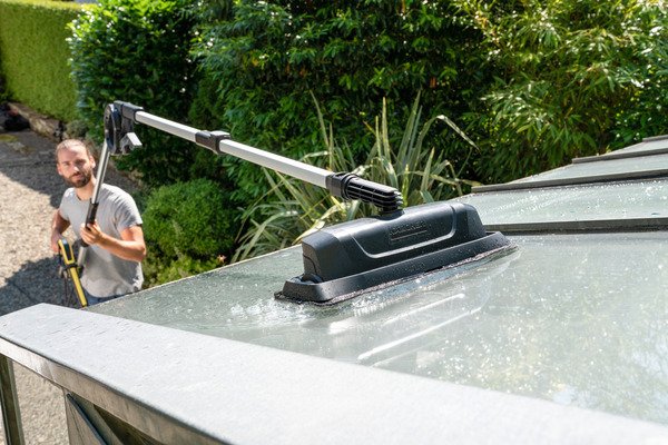 Решение для равномерной и эффективной очистки: насадка с 4 встроенными соплами высокого давления удаляет стойкие загрязнения с различных поверхностей. В зависимости от решаемой задачи ее можно быстро и легко оснастить одной из сменных рамок, входящих в комплект поставки. Щеточная рамка, предназначенная для чистки стен, благодаря щетине по периметру защищает пользователя от брызг воды и, кроме того, позволяет плавно перемещать насадку по поверхности. А для очистки стеклянных поверхностей (например, зимних садов) подходит рамка с падом из микроволокна, который закрепляется на ней липучкой. Его абразивные волокна способствуют лучшему отделению грязи и гарантируют бережную очистку поверхностей.