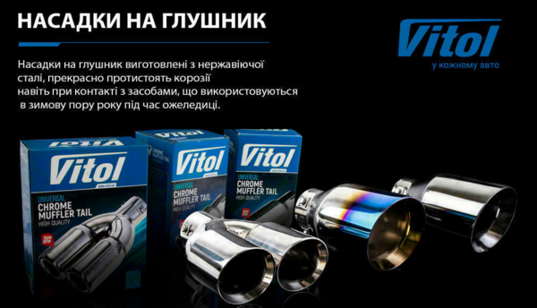 Насадка на глушитель от торговой марки Vitol изготовлена на современном высокоточном оборудовании, что гарантирует высокое качество исполнения изделия. Диаметры насадок соответствуют самому распространенному размеру выхлопных труб у глушителей легковых и грузовых автомобилей. Насадка на глушитель несет в себе два свойства, первое это защита выхлопной трубы от коррозии, практически полностью, исключая контакт выхлопной трубы с внешне средой, второе свойство - это улучшение эстетического вида автомобиля.