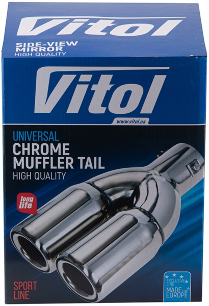Насадка на глушитель от торговой марки Vitol изготовлена на современном высокоточном оборудовании, что гарантирует высокое качество исполнения изделия. Диаметры насадок соответствуют самому распространенному размеру выхлопных труб у глушителей легковых и грузовых автомобилей. Насадка на глушитель несет в себе два свойства, первое это защита выхлопной трубы от коррозии, практически полностью, исключая контакт выхлопной трубы с внешне средой, второе свойство - это улучшение эстетического вида автомобиля.