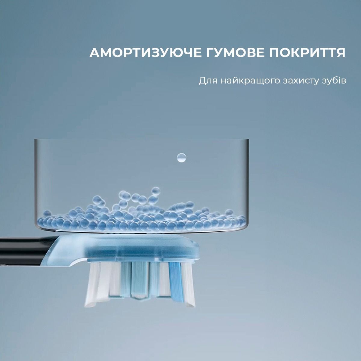 Насадки оснащены специальной амортизационной системой, которая позволяет щетинкам плавно адаптироваться к давлению и форме зубов. Это снижает нагрузку на десны и защищает эмаль от излишнего трения. Благодаря такой технологии щетинки мягко пружинят при чистке, обеспечивая комфортное и безопасное удаление налета, даже если вы случайно приложите слишком много усилий.